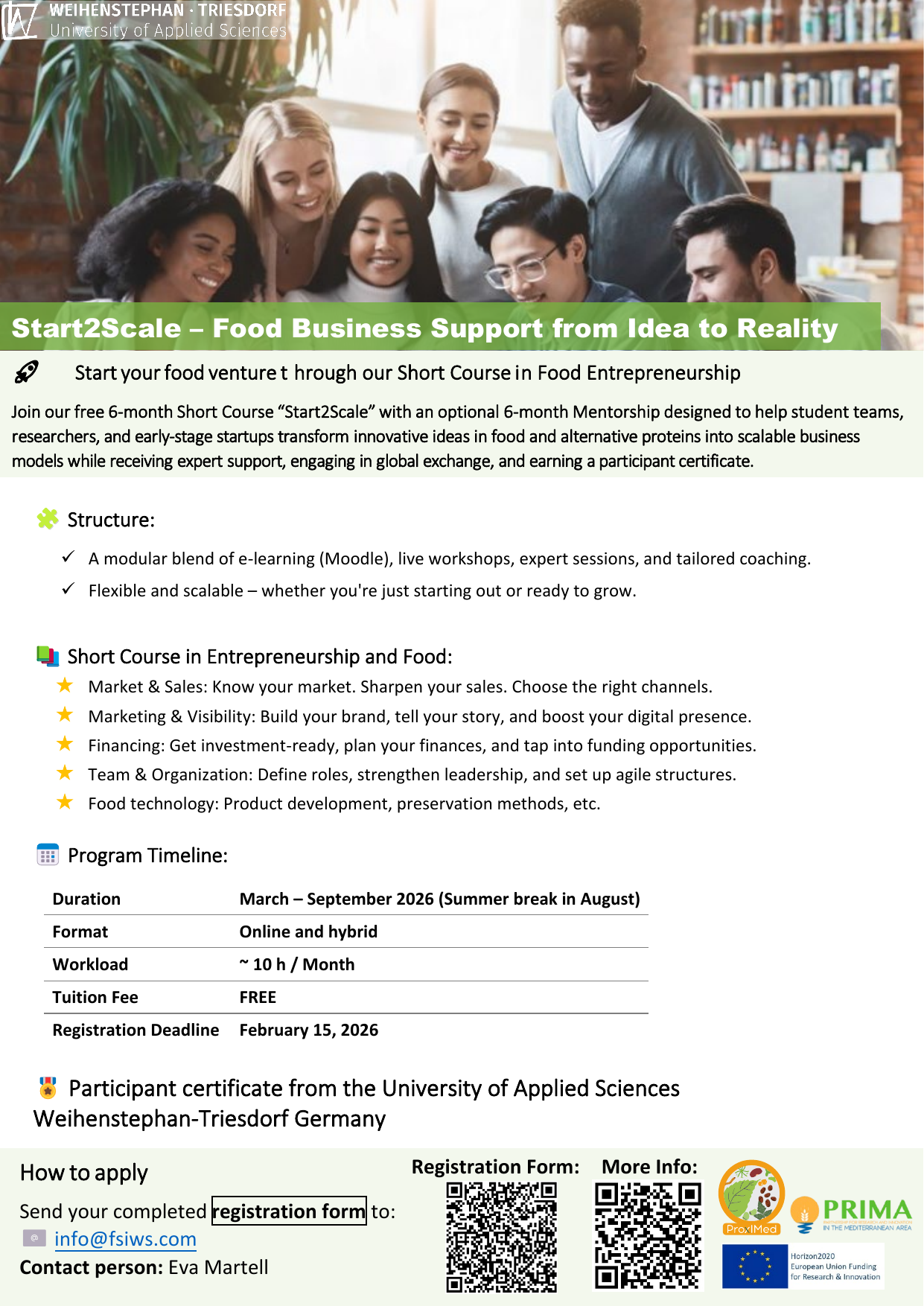 ProxIMed and Weihenstephan‑Triesdorf University of Applied Sciences are launching a 6‑month short course designed for students, researchers, and early‑stage founders working on food and alternative protein solutions. The program blends online learning, live sessions, and practical workshops to help you shape your concept, build a sound business model, and prepare for market entry. An optional mentorship phase follows for selected participants. Tuition is free, and successful completion earns a university certificate.